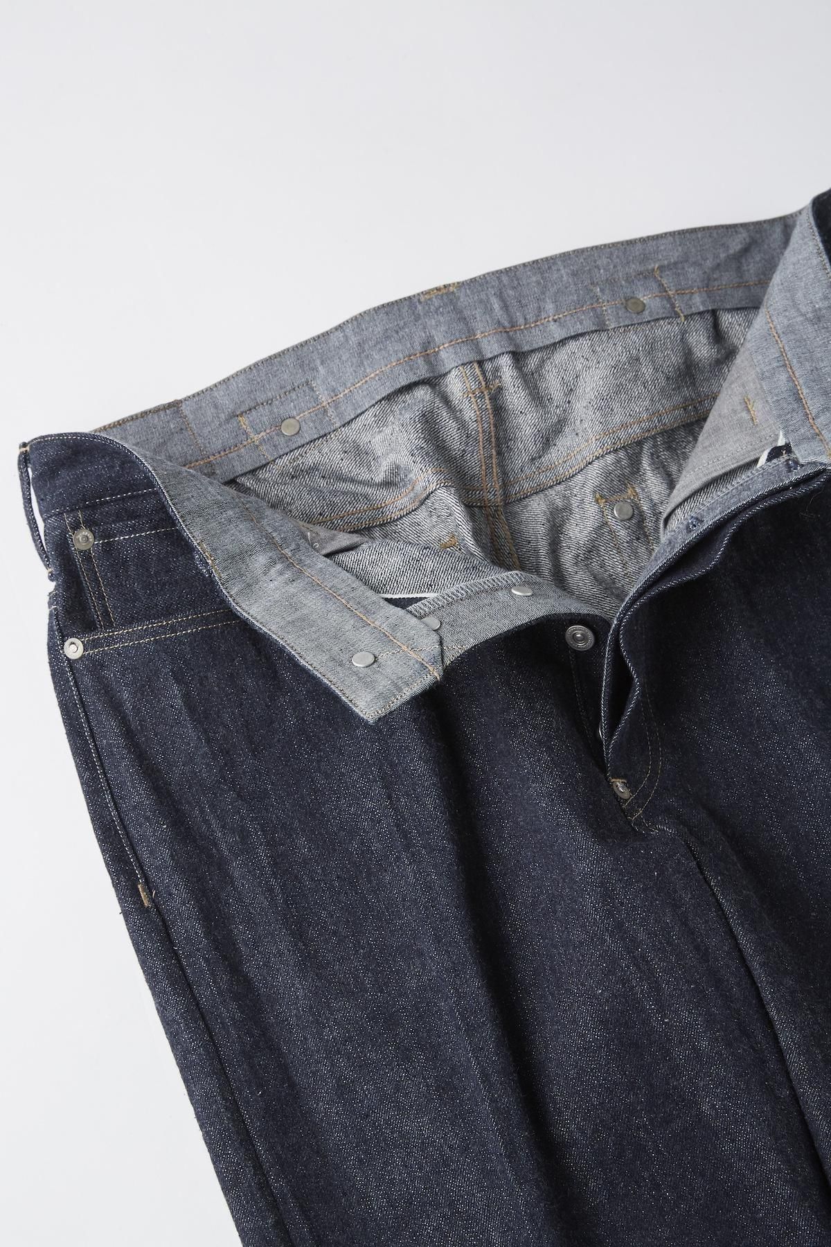 12.4oz OLDJOE original denim糸から拘り、オリジナルのバルキーさを表現し、ラスティックなネップ感を入れ込み、デニムの産地、井原にて製作しています。 経糸にムラ、ネップ形状の強いものを黒味の強いインディゴ染料で染色し、ヨコ糸は比較的ベージュ味の綿を厳選し強撚をかけて糸にしております。生地はいわゆるキバタと言われる織り上がった状態のものから、特殊な方法でサンフォライズ(防縮加工)のみをかけています。 通常の防縮方法とは違いますのでいわゆるリジッドデニムと呼ばれる表面にノリが付着した固い生地にはならず柔らかな手触りを表現しました。風合いや色味の重厚感、実際手に取った時の質感や、着用時の履きやすさ、糸使いも含めて、 OLDJOEならではのプリミティブかつモダンな存在感を持ったオリジナルデニム。